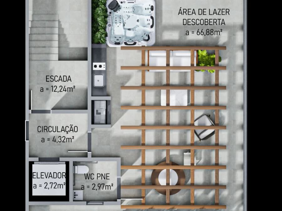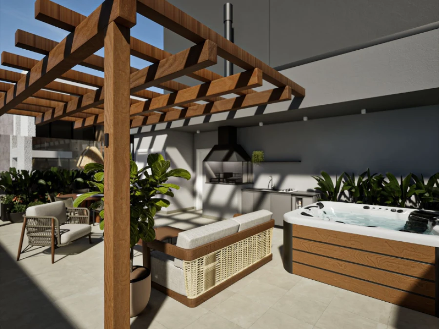 Espaço gourmet externo com churrasqueira à carvão, pergolado de madeira e SPA para 6 lugares, entregue mobiliado.