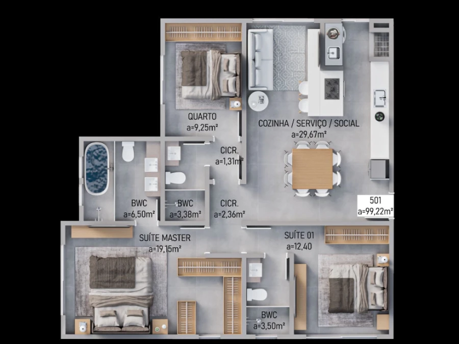 COBERTURA - Unidade 501 - 3 dormitórios, sendo 2 suítes - Área privativa: 99,70m²