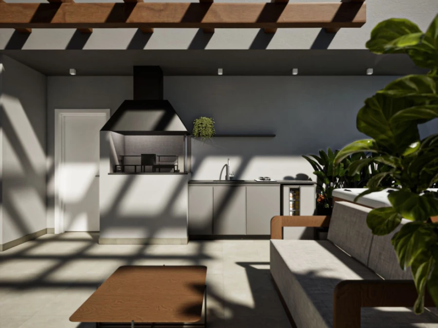 Espaço gourmet externo com churrasqueira à carvão, pergolado de madeira e SPA para 6 lugares, entregue mobiliado.