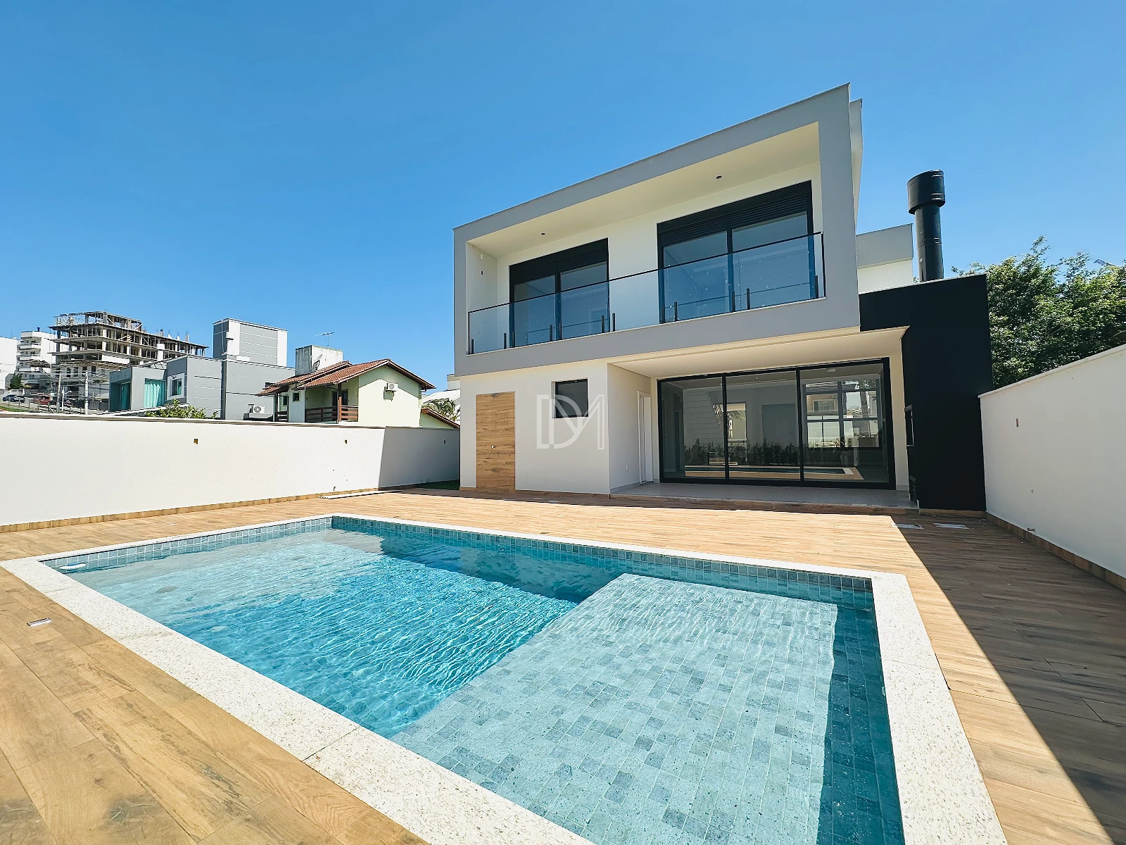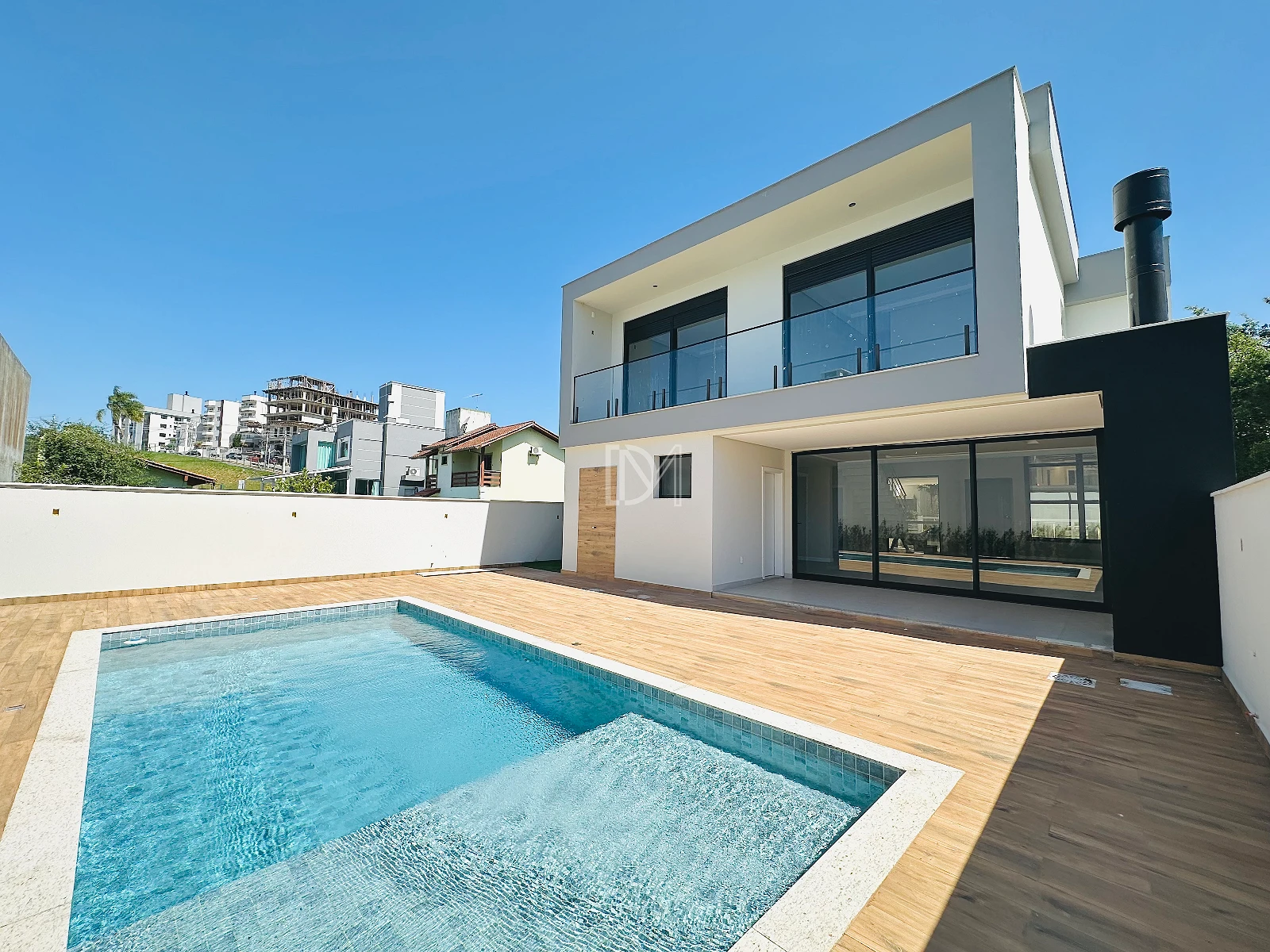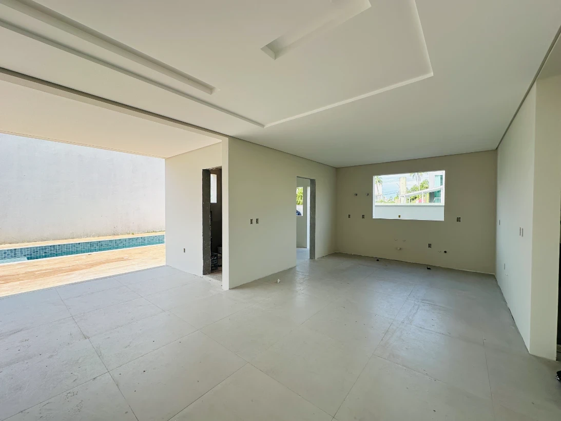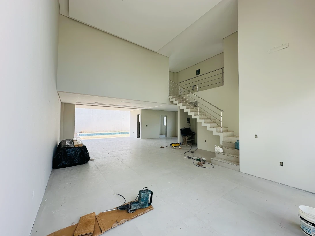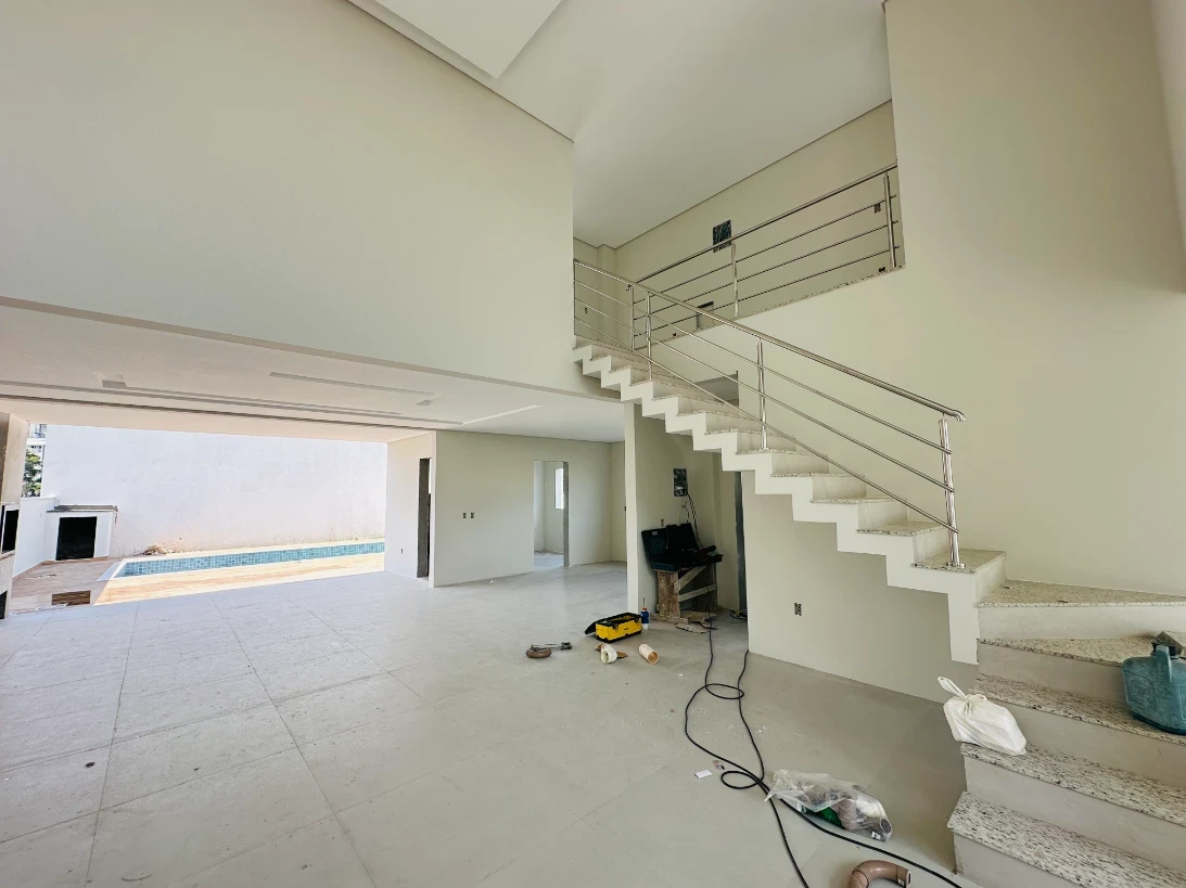 O imóvel possui 4 dormitórios, sendo 3 suítes, sala de estar e jantar com cozinha integrada, espaço gourmet na área da piscina, área de serviço e 2 vagas de garagem cobertas.