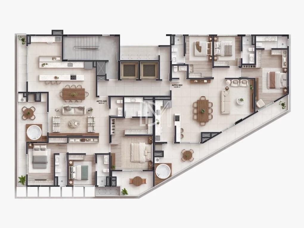 Acabamento de alto padrão, inclui piso porcelanato nas áreas sociais e piso vinílico nas áreas íntimas. As janelas e porta-janelas serão de alumínio, com soleiras e peitoris em granito e paredes duplas para melhor isolamento.